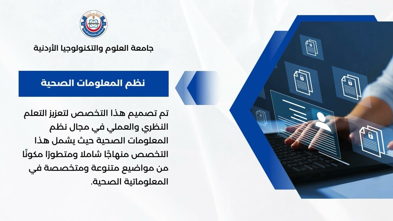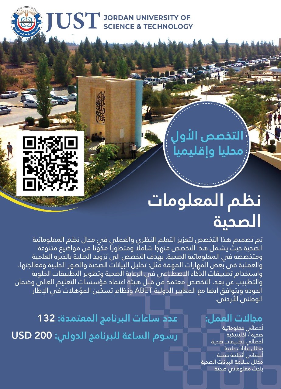 يُعنى تخصص نظم المعلومات الصحية بدراسة تصميم وتطبيق الأنظمة المعلوماتية لإدارة البيانات الصحية وتحليلها لتحسين جودة الرعاية الطبية ورفع كفاءتها. يمتزج فيه العلم الحاسوبي (برمجة، قواعد بيانات، شبكات) مع مبادئ الصحة العامة (علم الأوبئة، إدارة المستشفيات)، وقد أُطلق في 2024 كأول برنامج مختص بهذا المجال في الأردن لتلبية حاجة السوق المحلي والإقليمي للكوادر المؤهلة في تحليل البيانات الصحية والذكاء الاصطناعي الطبي، مع إتاحة فرص تدريب عملي ومشاريع بحثية في مرافق صحية محلية ودولية